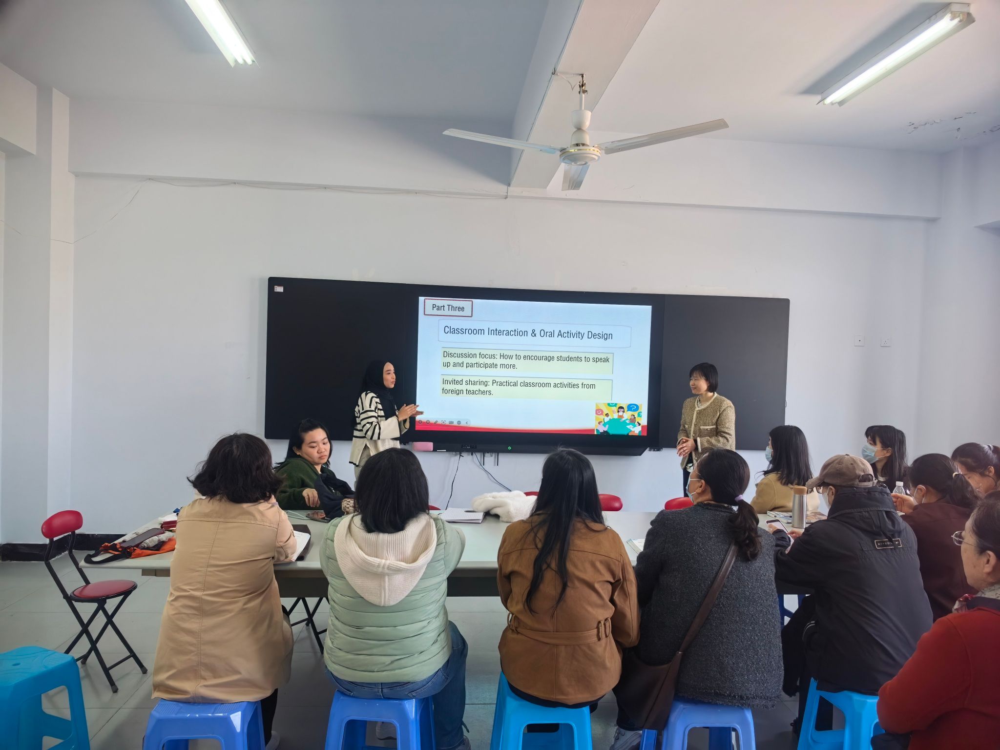 本次教研以 “课堂互动与口语活动设计”为核心,围绕 “如何鼓励学生主动开口、提升课堂参与度” 展开深度交流。外籍教师分享了情景模拟、任务型教学等实用课堂活动案例,介绍了沉浸式语言环境的营造方法;中方教师结合本校学生学情,交流了教学中的实践经验与现存困惑,双方针对不同基础学生的分层引导策略、互动活动的本土化适配等问题深入探讨,互学互鉴。活动现场研讨氛围浓厚,老师们积极分享课堂妙招、交流实操难点,同步梳理出口语课堂激趣引导、分层互动、即时反馈的实施要点。