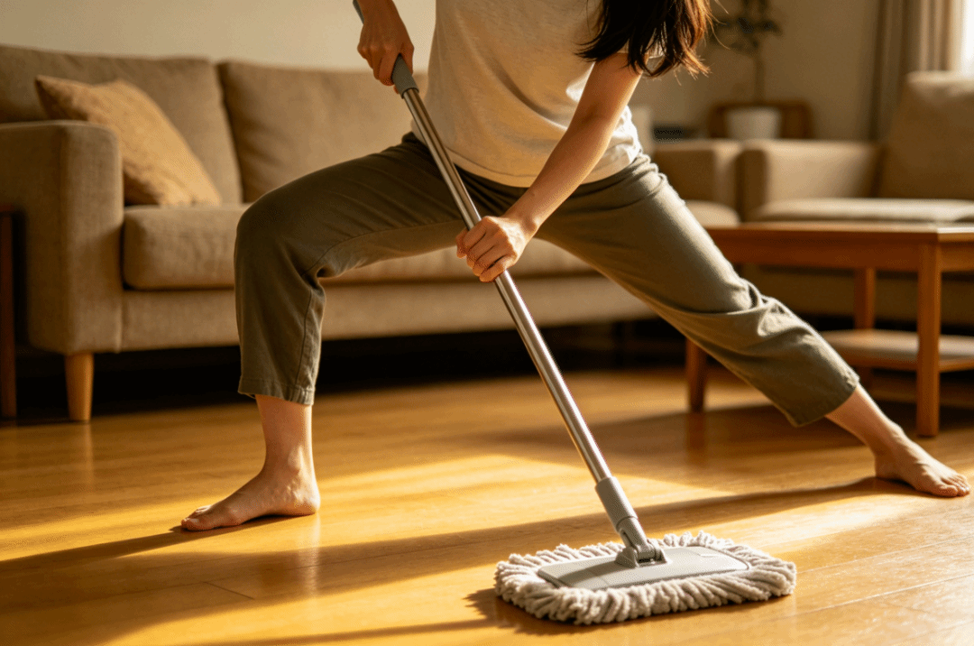 4. 拖地时弓步:左右交替拖地,顺便锻炼腿部